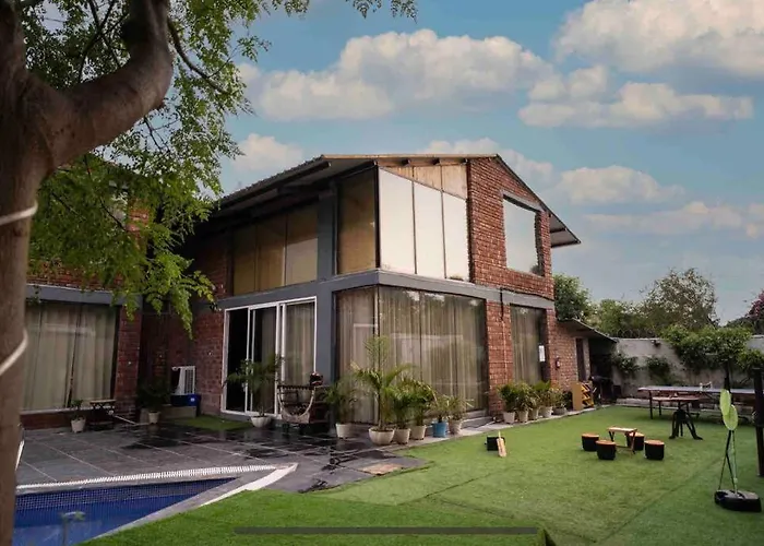 The Green Farm House stands out with its dual pool options, both indoor and outdoor, enhancing the relaxation experience for guests. Set around 12 km from Qutub Minar, it provides ample opportunities to unwind with access to a sauna and hot tub facilities. Spacious gardens enhance the property's allure for outdoor activities. Its location ensures easy access to historical sites for exploration while balancing leisure with cultural immersion. For families, it offers ample space and thoughtful amenities.